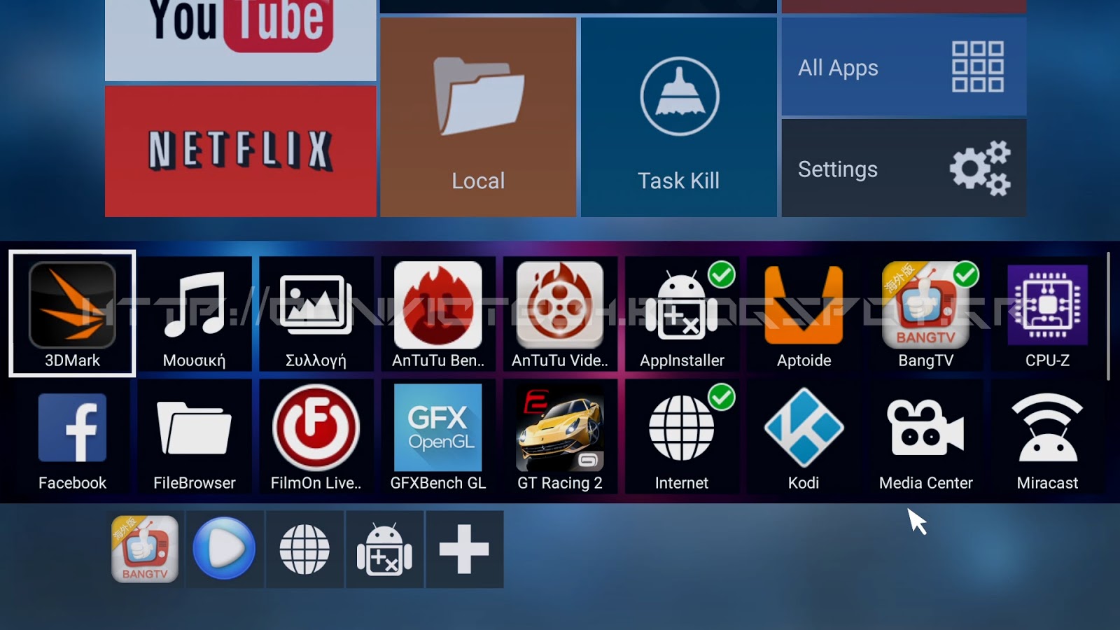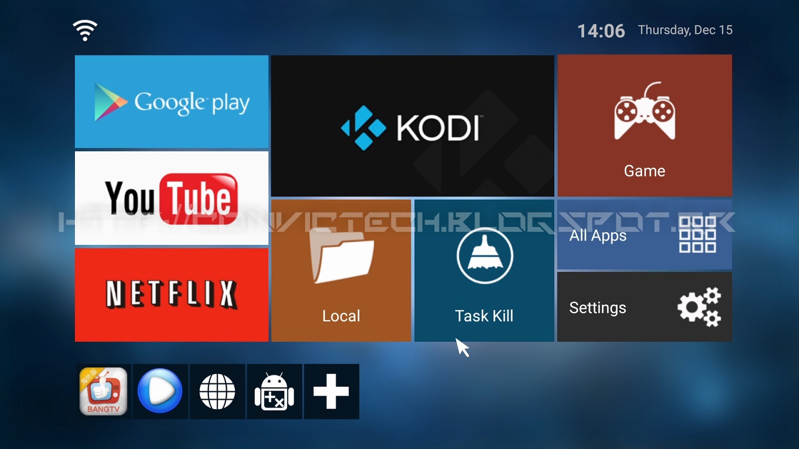قامت Shenzen Tomato بتجهيز الجهاز مع MediaBox Launcher الذي يتكون من بلاطات لجميع الوظائف والتطبيقات الأساسية مثل Kodi ، و File Explorer ، و Goole Play Store ، و YouTube ، و Netflix ، والإعدادات والألعاب