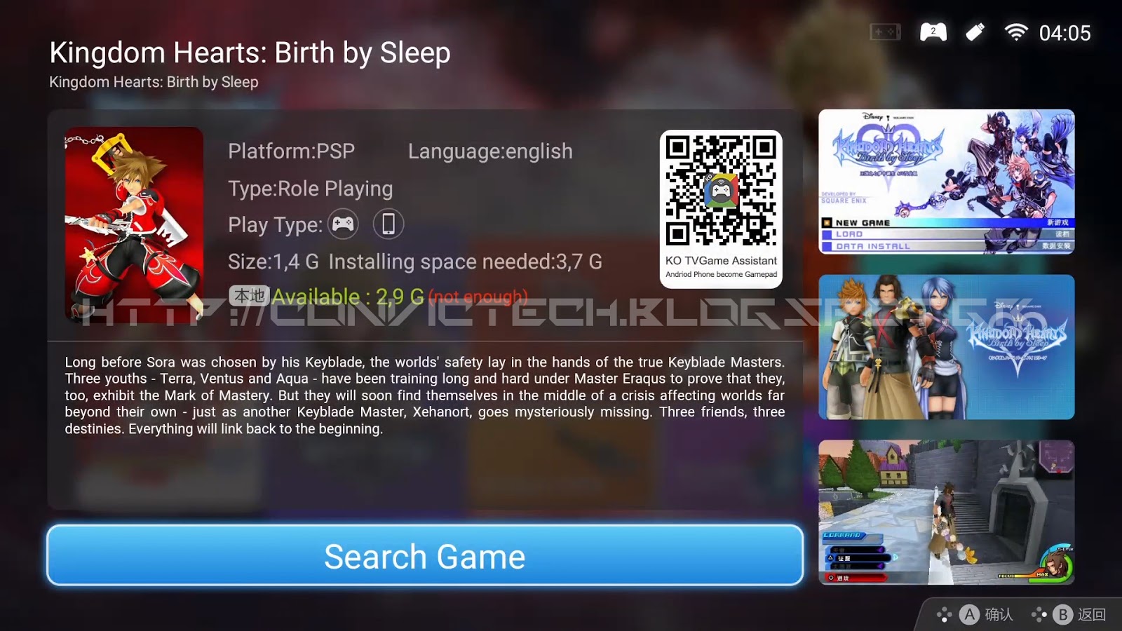في إعدادات KO Gamebox ، لدينا مدير ألعاب حيث نرى ألعابنا التي تم تنزيلها ، ومؤسسة GamePad ، وإدارة التخزين وتحديث الأداة المساعدة