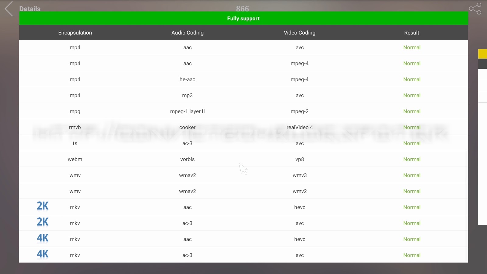من بين 30 تنسيقات فيديو يختبر هذا التطبيق ، 27 حيث تم دعمها بالكامل و 3 مدعومًا جزئيًا بواسطة Android مما يمنحنا تشغيل متقطع