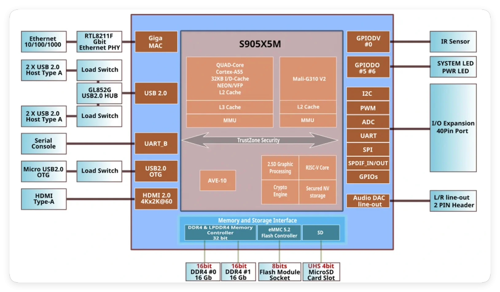 Built on an efficient 12nm process, the Amlogic S905X5M processor strikes a balance between performance and power consumption. This reduces cooling requirements, extends product lifespan, and enables fanless designs — a key benefit for OTT devices and embedded systems.